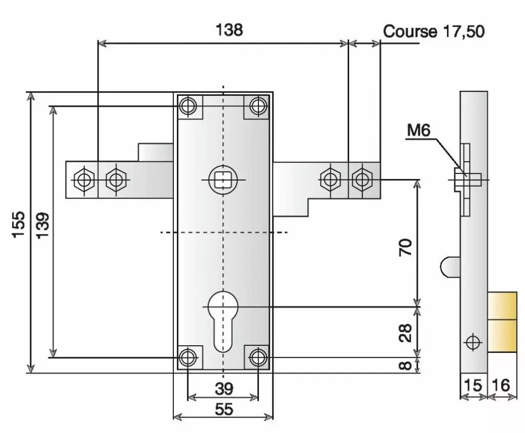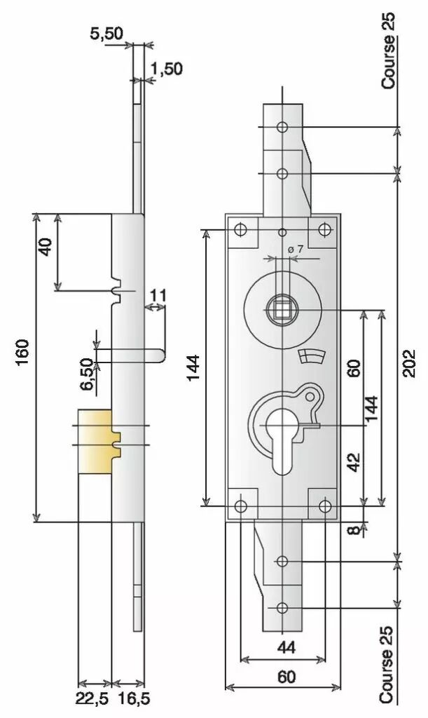 2 points latéraux - coffre acier bichromaté Débloquage de l'extérieur à la clé 1/4 de tour Ouverture et fermeture de la porte de l'int comme de l'ext à la béquille - pênes à ressorts autorisant un empennage automatique à la fermeture livrée sans tringle et sans cylindre - Série 6563