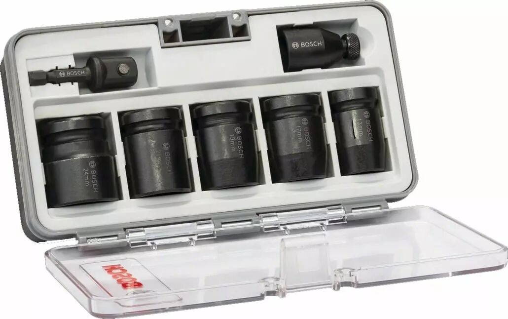 Composé de 5 douilles adaptables (13, 17, 19, 21 et 24) - 1 adaptateur 1/2" - 1/4" et 1 adaptateur 1/4" - 1/2"