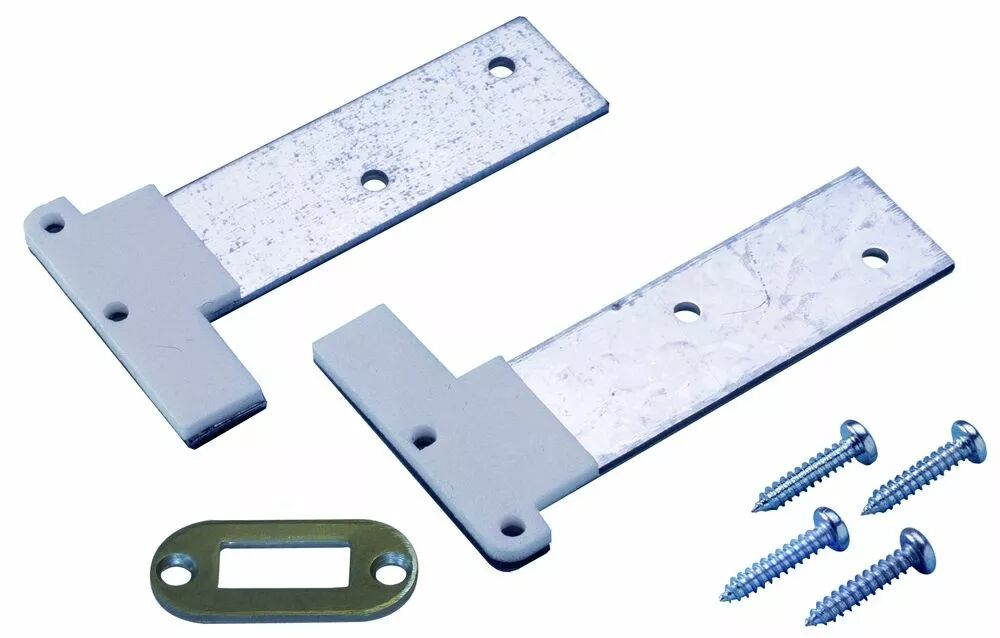 Patte en bout en acier avec une mousse collée + vis - nécessaire pour assurer l'étanchéité à l'extrémité du seuil et pour fixer le pied de dormant Gâche en acier - nécessaire pour éviter l'usure du PVC par la tige de crémone