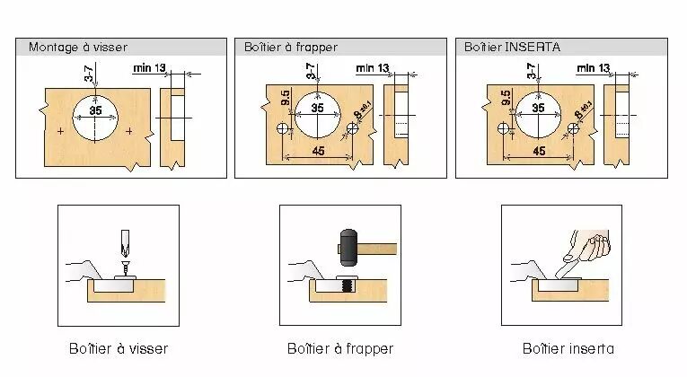 pour les charnières à enfoncer, utiliser obligatoirement soit la matrice BLU 864 (machine) ou BLU 865 (manuel).