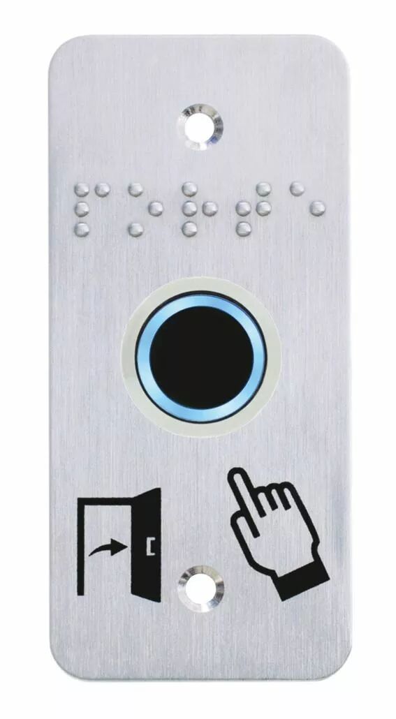 Dimensions (ø face avant x ø corps x longueur) 41 x 37,7 x 22 mmDimensions plaque : 8 x 8 mmavec plaque inox marqué “porte/doigt” et braille - 12/24 VDCdistance de réaction programmable