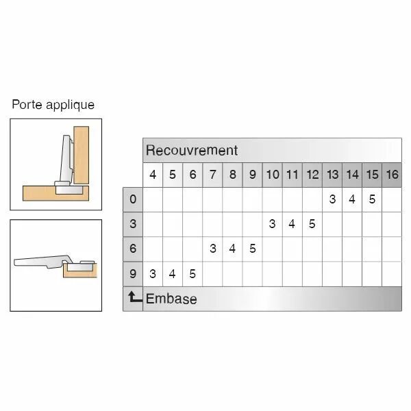 Finition : acier nickelé.Montage : par clipsage.Réglage recouvrement : sur charnière - 3,5 / + 0,5 mm.Réglage hauteur : sur embase - 3,0 / + 3,0 mm.Réglage profondeur : sur charnière - 1,0 / + 3,0 mm.