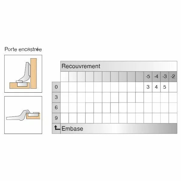 Finition : acier nickelé.Montage : par clipsage.Réglage recouvrement : sur charnière - 3,5 / + 0,5 mm.Réglage hauteur : sur embase - 3,0 / + 3,0 mm.Réglage profondeur : sur charnière - 1,0 / + 3,0 mm.