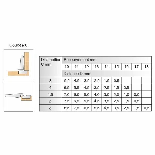 Finition : acier nickelé. Montage : par clipsage. Profondeur de perçage 11,8 mm. Réglage recouvrement : sur charnière - 2,5/ + 1,0 mm.Réglage haut. : sur embase - 2,0 / + 2,0 mm. Réglage prof. : sur charnière - 2,0 / + 2,0 mm.