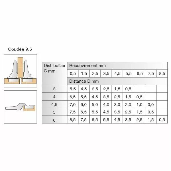 Réglage recouvrement : sur charnière - 2,0 / + 2,0 mm. Réglage haut. : sur embase - 2,0 / + 2,0 mm. Réglage prof. : sur charnière - 2 / + 3 mm.A utiliser avec embase HET 491. Sensys (amortisseur intégré).