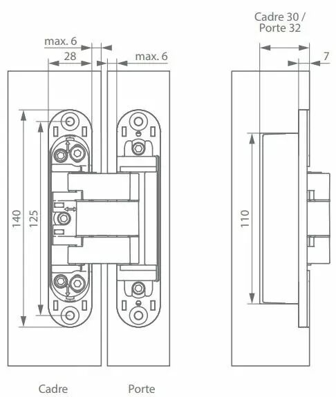 Profondeur encastrement : 30 mm (cadre) / 32 mm (porte).