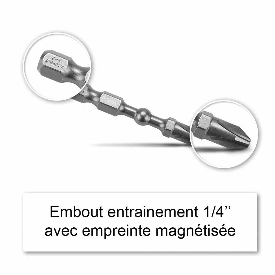 1 porte-embouts 1/4 magnétique 50 mm 3 embouts Philips : PH1-PH2-PH3 3 embouts Pozidriv : PZ1-PZ2-PZ3 7 embouts Torx : T10-T15-T20-T25-T27-T30-T40 6 embouts Torx Securité : T10H-T15H-T20H-T25H-T27H-T30H 4 embouts Hex : H3-H4-H5-H6 3 embouts plats :