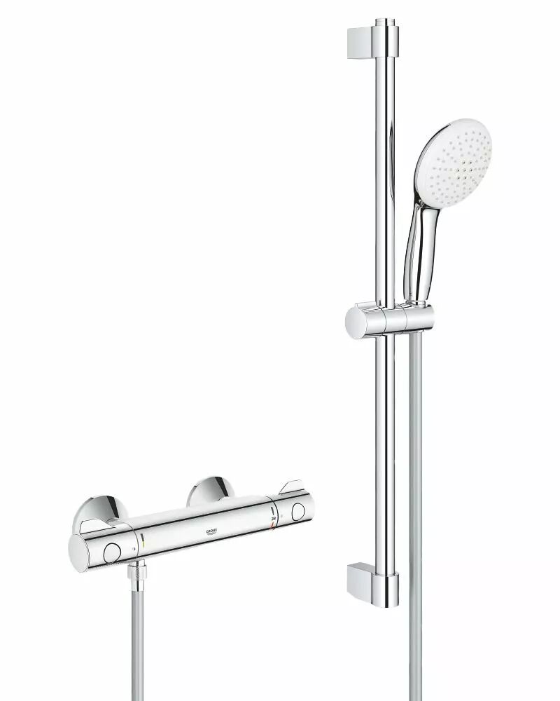 Le kit comprend : 1 barre de douche 600 mm - 1 mitigeur thermostique Grohtherm 800 - 1 douchette Tempesta 2 jets ø 100 mm - 1 flexible Relexaflex 1,75 m
