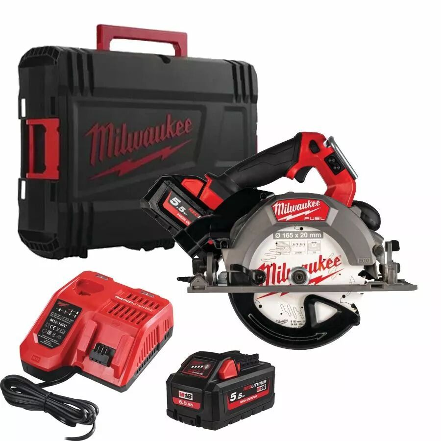 Livrée en coffret de transport avec 1 adaptateur - 1 guide latéral - 1 lame ø 165 mm - 2 batteries M18 HB 5.5 - 1 chargeur M12-1