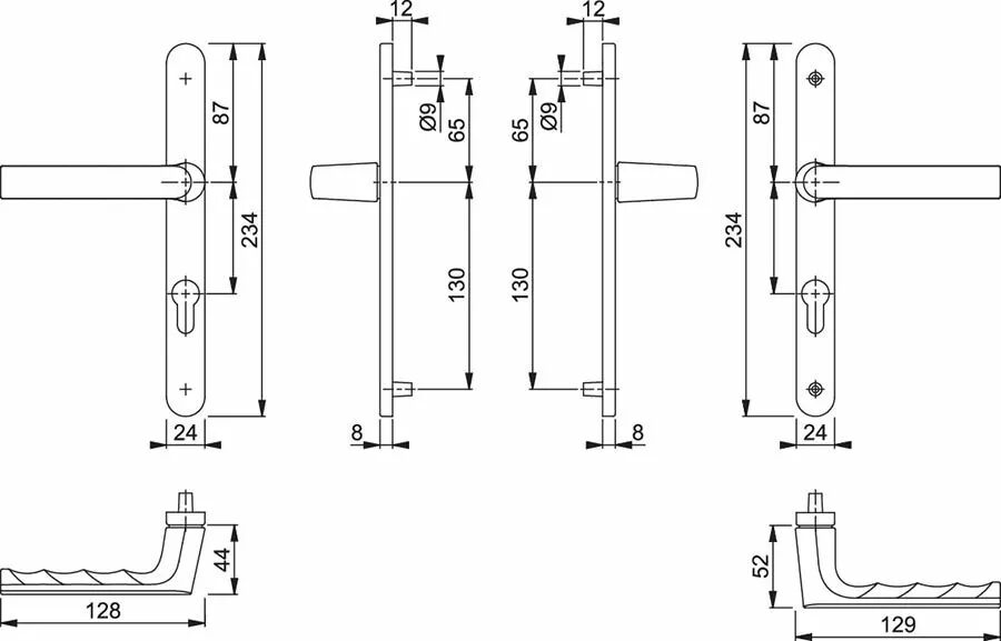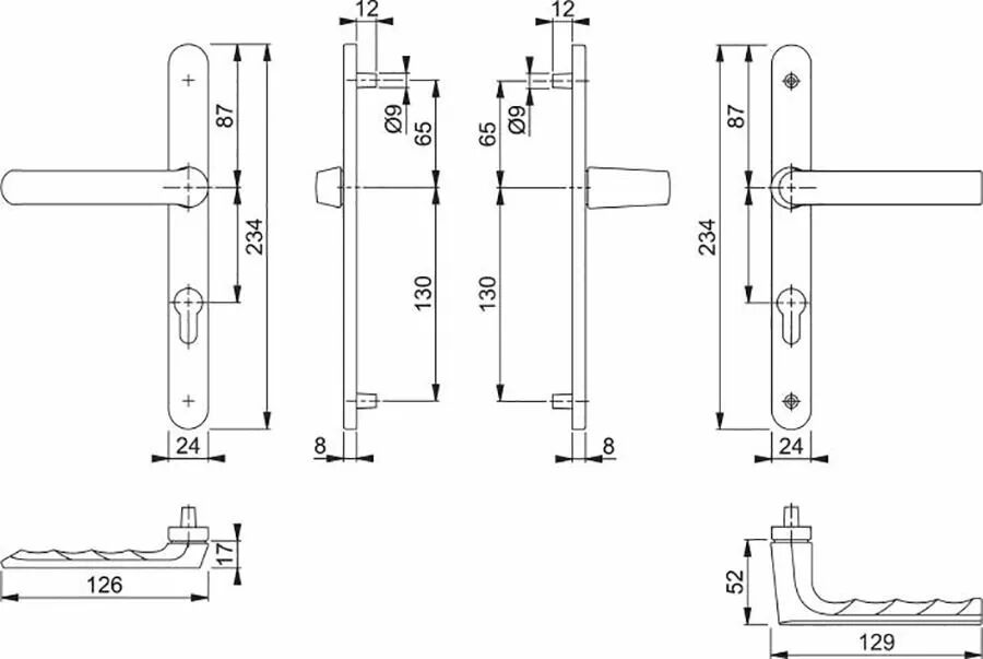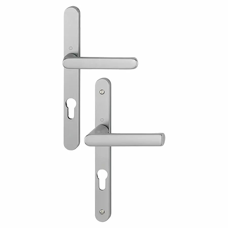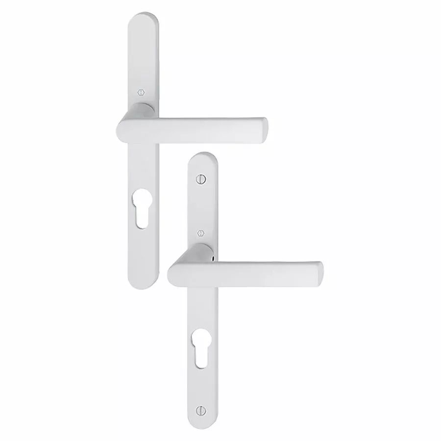 Garniture double HOPPE Hamburg sur plaques étroites (24 x 234 mm) pour porte-fenêtre. Entraxe 70 mm, Aluminium Blanc F9016. Montage rapide. Référence 12230832.
