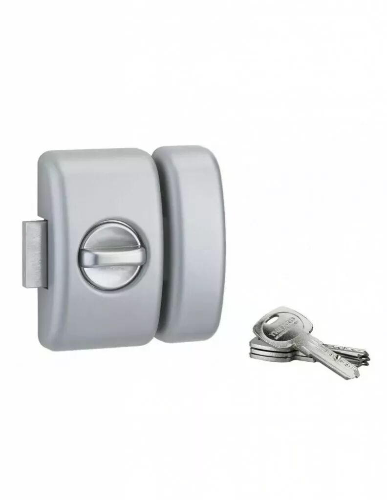 S’ouvre à la clé depuis l’extérieur et au bouton à l’intérieur. Bon compromis entre sécurité et simplicité. Avantage : adaptable à tous types de portes. Inconvénient : selon le modèle, pose plus technique.
