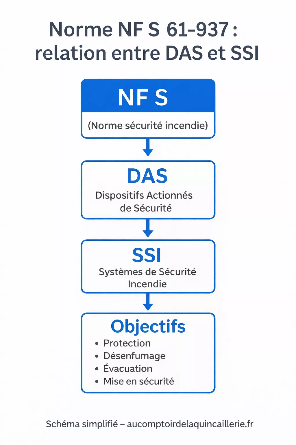 La norme NF S 61-937 définit les exigences techniques applicables aux Dispositifs Actionnés de Sécurité (DAS) et aux Systèmes de Sécurité Incendie (SSI). Elle vise à garantir que les équipements réagissent de manière automatique et fiable en cas d’incendie. Ces dispositifs peuvent déclencher :