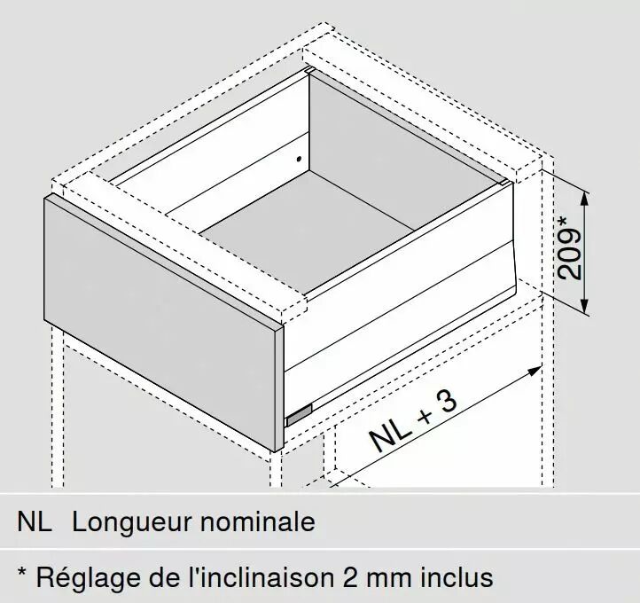 Débit : côte intérieure caisson - 224 mm Pour largeur intérieur caisson compris entre 243 et 296 mm