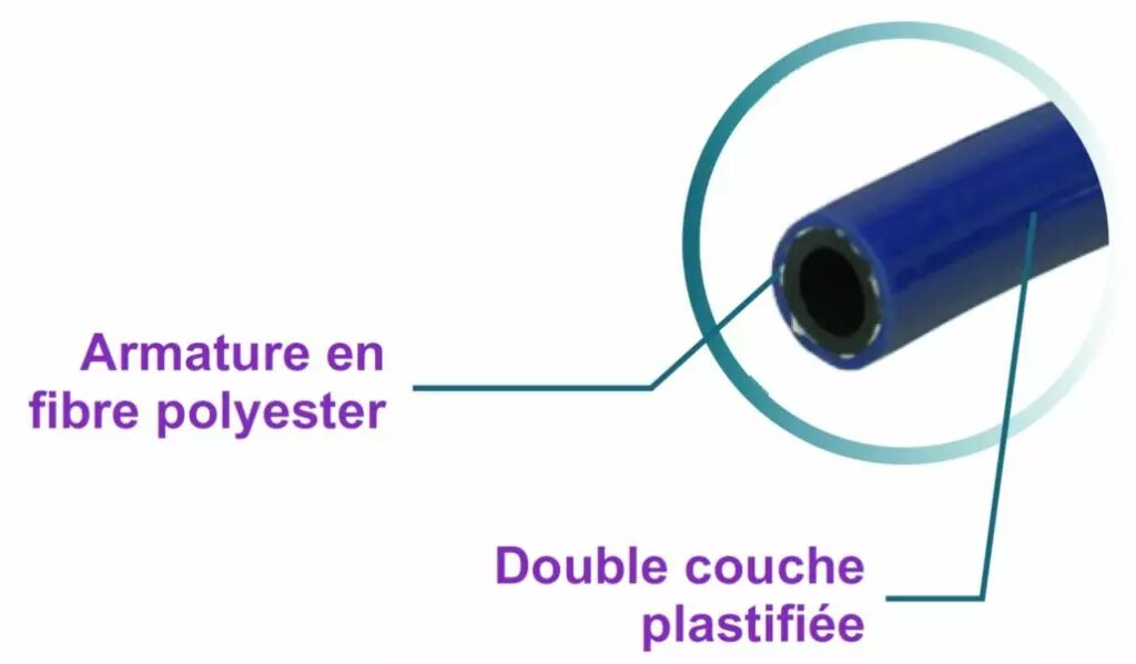 Tuyau PVC souple double couche plastifiée avec armature en fibre ployester.Haute résistance. Pression de service 20 bars.Léger (environ 140 g/m).Equipé de raccords mâle et femelle.