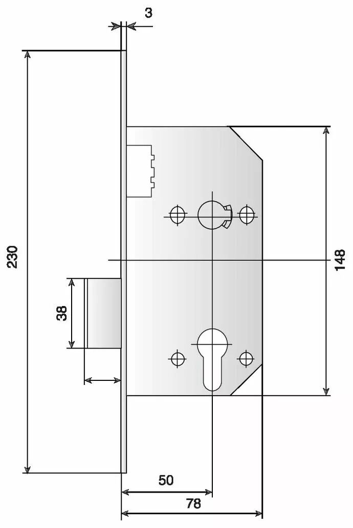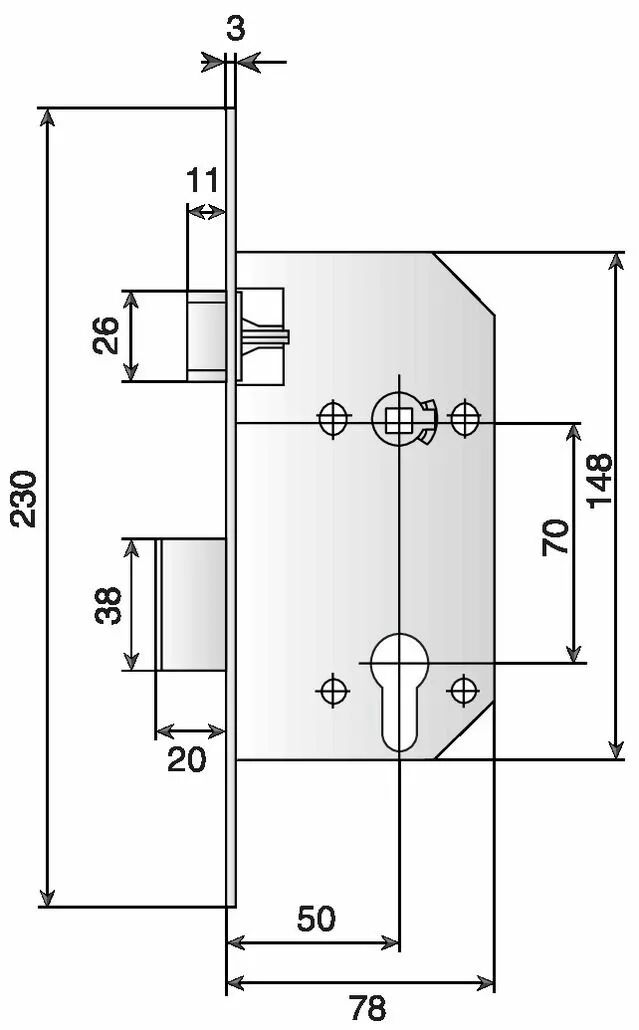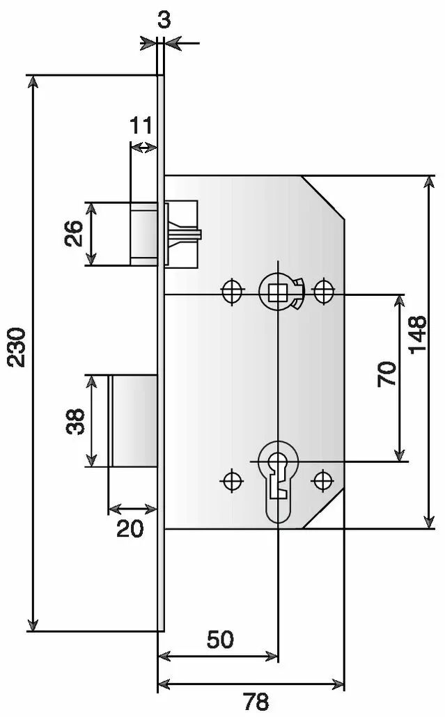 Pêne dormant seul - NF P26 - 414 - têtière bouts carrés - avec gâche
