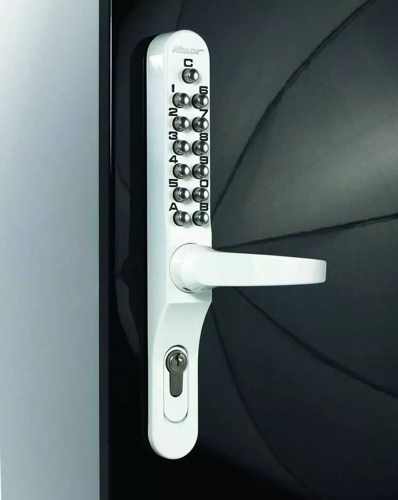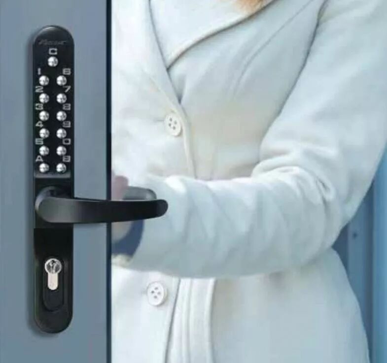 Remplace la garniture existante Plus de 4 combinaisons Epaisseur de porte de 25 à 55 mm Réversible Installation à l'intérieur ou à l'extérieur Fonctionnement : côté extérieur la serrure s'ouvre avec la béquille après avoir appuyé sur la touche ` C ` et les 4 à 6 touches de la combinaison choisie Elle se ferme automatiquement après chaque passage Le cylindre européen (non fournie) permet d'ouvrir la porte sans passer par le système à code (fonction clé de secours) Il permet également d'interdire provisoirement la fonction d'entrée par le code Côté intérieur la serrure s'ouvre et se ferme librement - codage rapide par simple rotation d'index sans ouvrir le boîtier