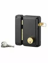 Coffre et gâche acier embouti époxy noir Pêne demi/tour laiton Double cylindre laiton, 5 goupilles, ø 25 mm, 3 clés L X H X E : 76 x 114 x 25 mm Axe clé : 45 mm Largeur du pêne demi/tour de 18 mm Largeur de la gâche de 32 mm Largeur du pêne dormant de 45 mm Longueur du canon de 45 mm
