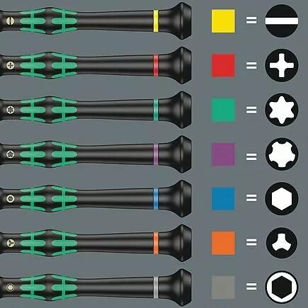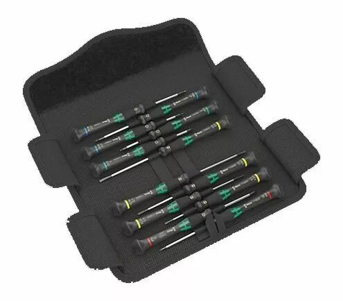 Jeu de 12 tournevis de précision comprenant :5 tournevis plats : 0,23 x 1,5 mm - 0,3 x 1,8 mm - 0,4 x 2,0 mm - 0,4 x 2,5 mm - 0,5 x 3,0 mm2 tournevis Phillips : PH0 - PH002 tournevis Torx : T5 - T63 tournevis 6 pans : 0,9 mm - 1,5 mm - 2,0 mm